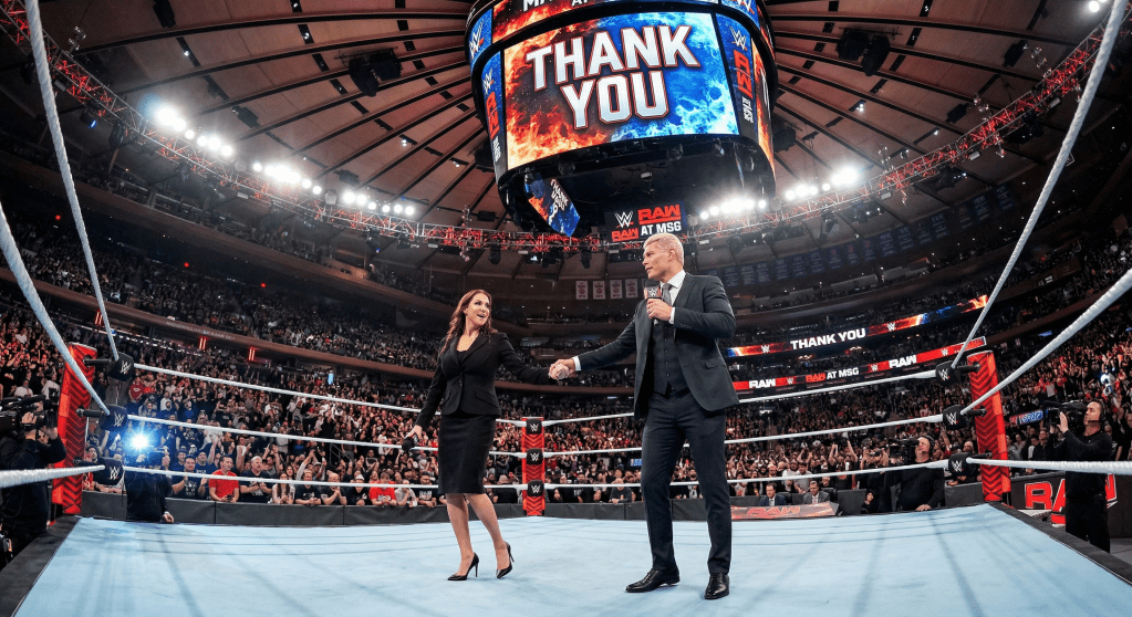 Cody Rhodes is in the ring, and Stephanie McMahon has joined him. Steph just told Cody he needs to “think” like Randy Orton. Stephanie slapped Cody, which I wondered if was smart. Steph went to walk away, Cody grabbed her arm and swung her around. He looked at Steph and said I have two words for you. The Universe yelled Suck it, ” but Cody said, “Thank you.”